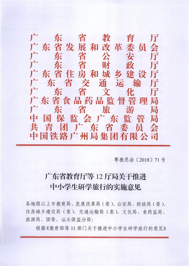 廣東省教育廳等12廳局關(guān)于推進(jìn)中小學(xué)生研學(xué)旅行的實(shí)施意見(jiàn)