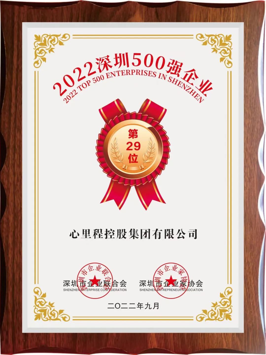 9月21日,深圳市企業(yè)聯(lián)合會(huì)、深圳市企業(yè)家協(xié)會(huì)(簡稱深圳企聯(lián))正式發(fā)布“2022深圳企業(yè)500強(qiáng)榜單”及《2022深圳500強(qiáng)企業(yè)發(fā)展報(bào)告》。心里程集團(tuán)榮登榜單第29位,較2021年上升6位。