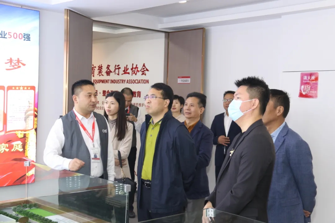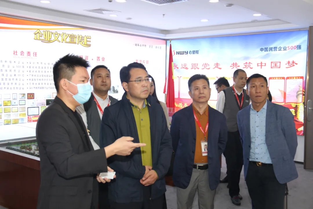 彭國(guó)遠(yuǎn)董事長(zhǎng)(左一)陪同匡志鎮(zhèn)黨委書記(左二)參觀心里程集團(tuán)