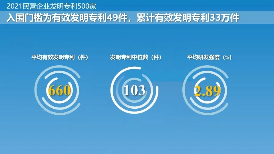 報告透露,“2021民營企業(yè)研發(fā)投入500家榜單”入圍門檻為上年度研發(fā)投入2.37億元。500家企業(yè)研發(fā)費用總額7429億元,其中,研發(fā)投入最高的企業(yè)研發(fā)費用1419億元。“2021民營企業(yè)發(fā)明專利500家榜單”入圍門檻為擁有有效發(fā)明專利49件。500家企業(yè)累計擁有有效發(fā)明專利33萬件,其中,有效發(fā)明專利最多的企業(yè)共擁有9萬件發(fā)明專利。