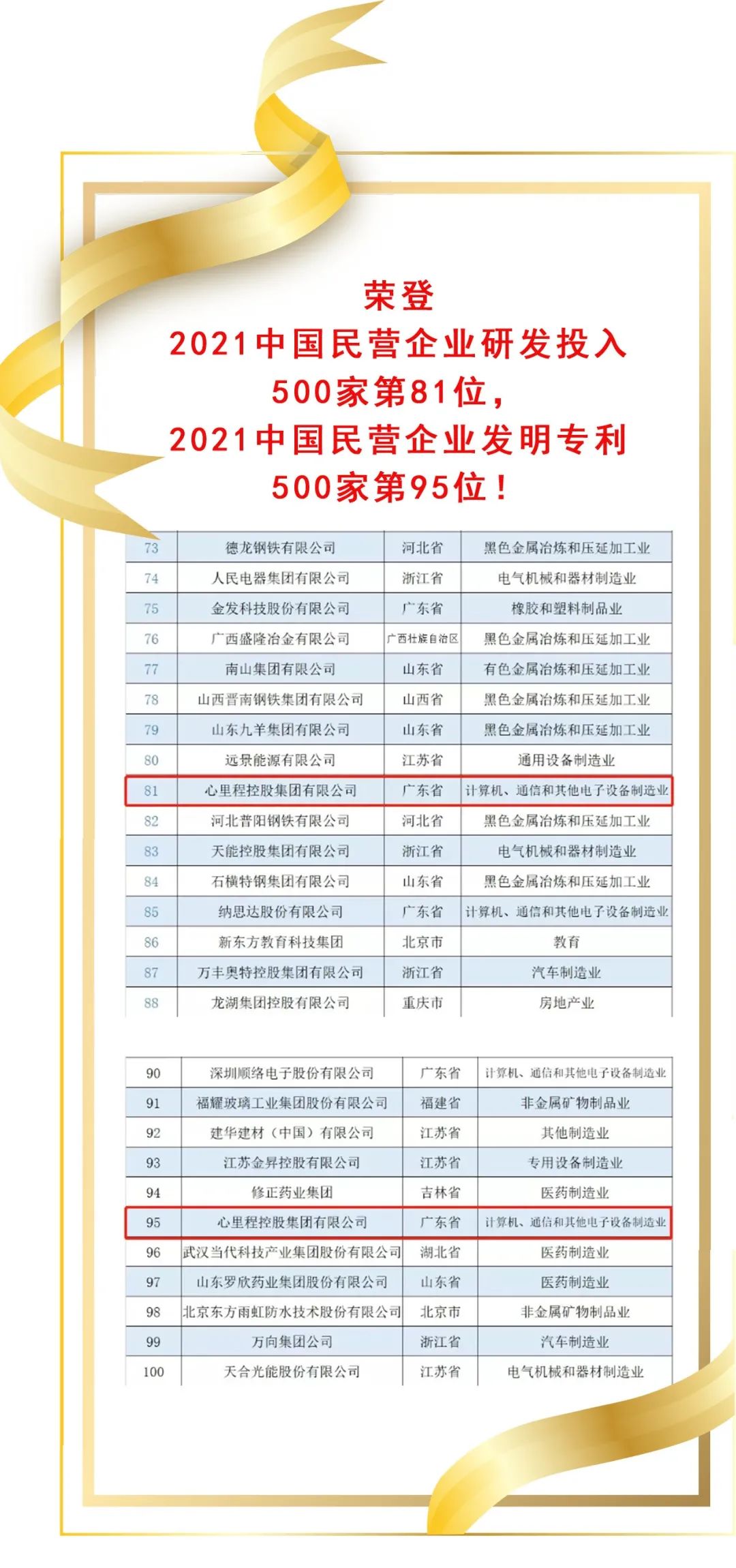 2021年,全國工商聯(lián)在對(duì)5785家上年度營業(yè)收入5億元以上的民營企業(yè)科技創(chuàng)新情況,進(jìn)行研究分析基礎(chǔ)上,形成“2021民營企業(yè)研發(fā)投入500家”“2021民營企業(yè)發(fā)明專利500家”榜單。心里程集團(tuán)榮登“2021民營企業(yè)研發(fā)投入500家”榜單第81位,“2021民營企業(yè)發(fā)明專利500家”榜單第95位。