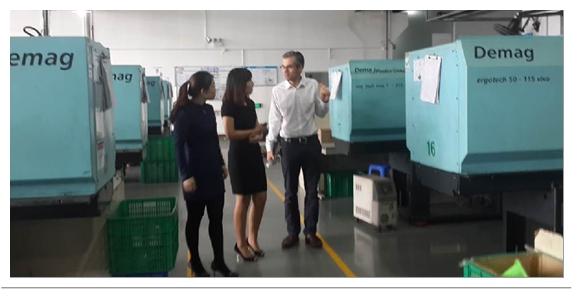 Daivd在我們的陪同下參觀生產(chǎn)車間,對我們的生產(chǎn)注塑機(jī)臺進(jìn)行考察。