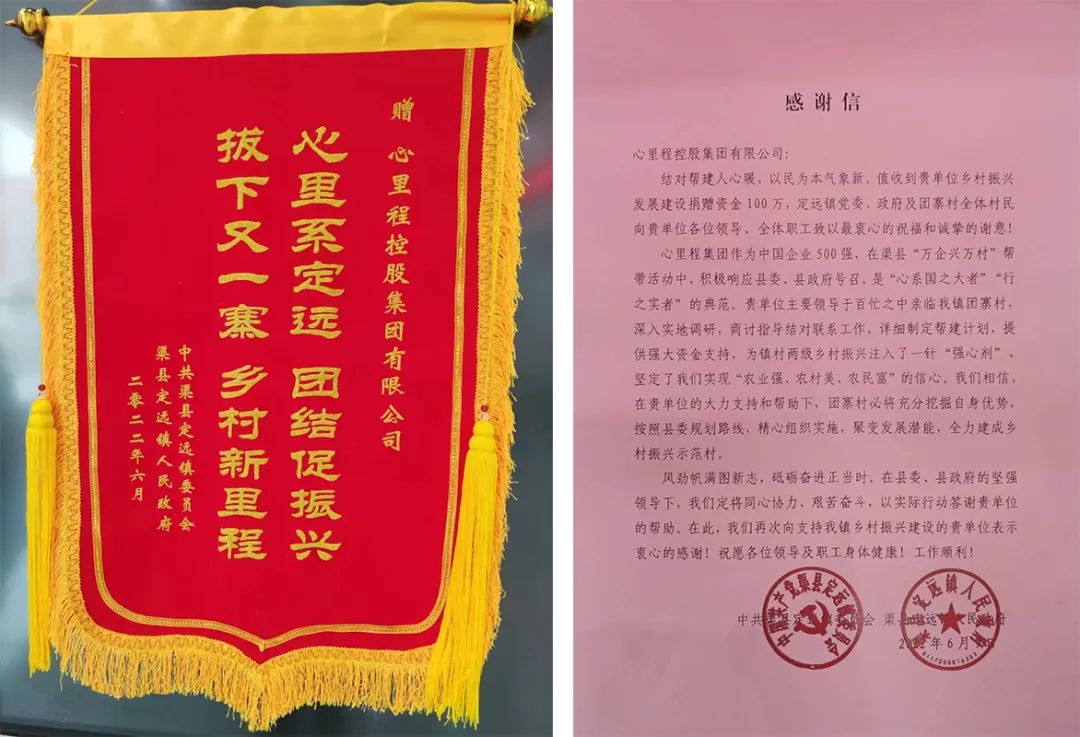 近日,為感謝心里程集團(tuán)在渠縣“萬企興萬村”幫帶活動(dòng)中,積極響應(yīng)渠縣縣委、縣政府號(hào)召,捐資100萬元支持渠縣定遠(yuǎn)鎮(zhèn)團(tuán)寨村鎮(zhèn)村兩級(jí)鄉(xiāng)村振興的善舉,四川省達(dá)州市渠縣定遠(yuǎn)鎮(zhèn)鎮(zhèn)長鄭卓林、團(tuán)寨村支部書記張長春、團(tuán)寨村笫一書記王天鎵等領(lǐng)導(dǎo)一行為四川心里程送來了錦旗和感謝信。心里程控股集團(tuán)副總裁、四川渠心科技集團(tuán)有限公司董事長彭國委等領(lǐng)導(dǎo)熱情接待鄭鎮(zhèn)長一行領(lǐng)導(dǎo),并代表心里程集團(tuán)接受錦旗及感謝信。