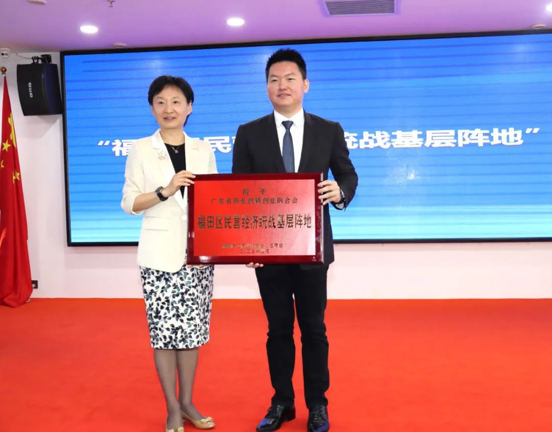 王曉蓉副主席為廣東省商業(yè)創(chuàng)新創(chuàng)業(yè)聯(lián)合會(huì)頒發(fā)“福田區(qū)民營經(jīng)濟(jì)統(tǒng)戰(zhàn)基層陣地”牌匾