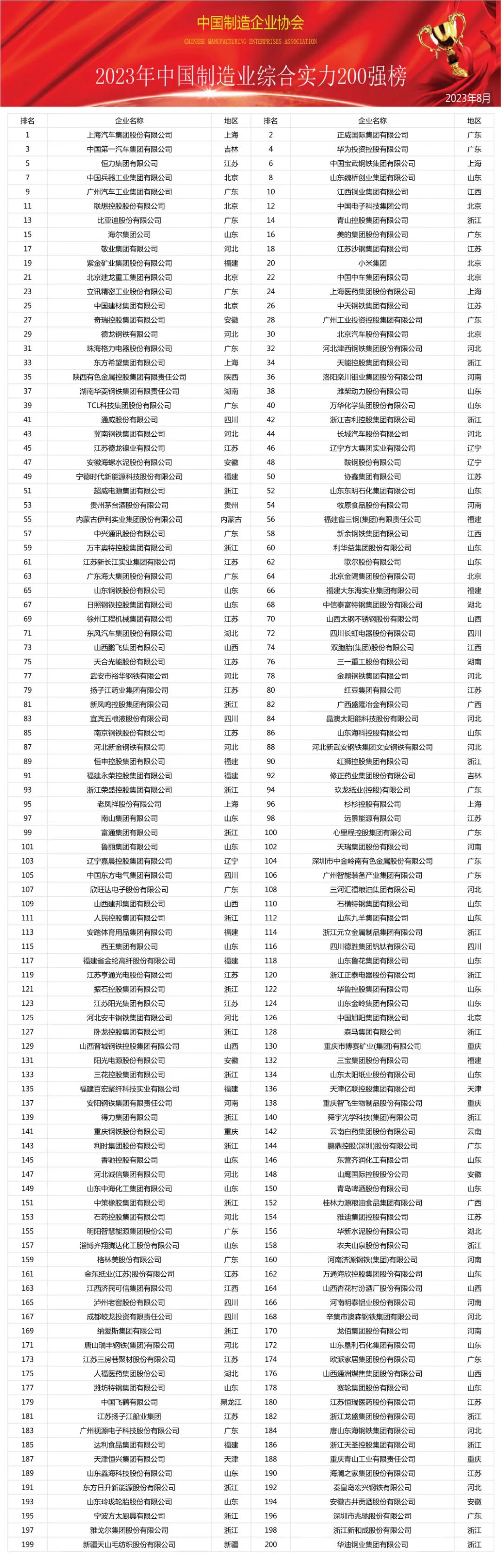 據(jù)悉,2023年《中國制造業(yè)綜合實力200強(qiáng)》暨《中國裝備制造業(yè)100強(qiáng)》排行榜是通過對超過8000家利潤總額在5000萬元至500億元之間的中國大陸制造型企業(yè)進(jìn)行了數(shù)據(jù)采集研究,基于對財務(wù)分析、行業(yè)分析、市場占有率分析確定候選企業(yè),邀請100位企業(yè)高管、學(xué)者及官員對經(jīng)資格審核符合要求的企業(yè)進(jìn)行評選,比照國際上通行的做法,根據(jù)營業(yè)收入、資產(chǎn)總額、利潤總額、所有者權(quán)益、研發(fā)投入、從業(yè)人數(shù)等指標(biāo)對候選企業(yè)進(jìn)行綜合評分排出,并對部分候選企業(yè)進(jìn)行實地拜訪,從中遴選出200家《中國制造業(yè)綜合實力200強(qiáng)》企業(yè)及100家《中國裝備制造業(yè)100強(qiáng)》企業(yè)。