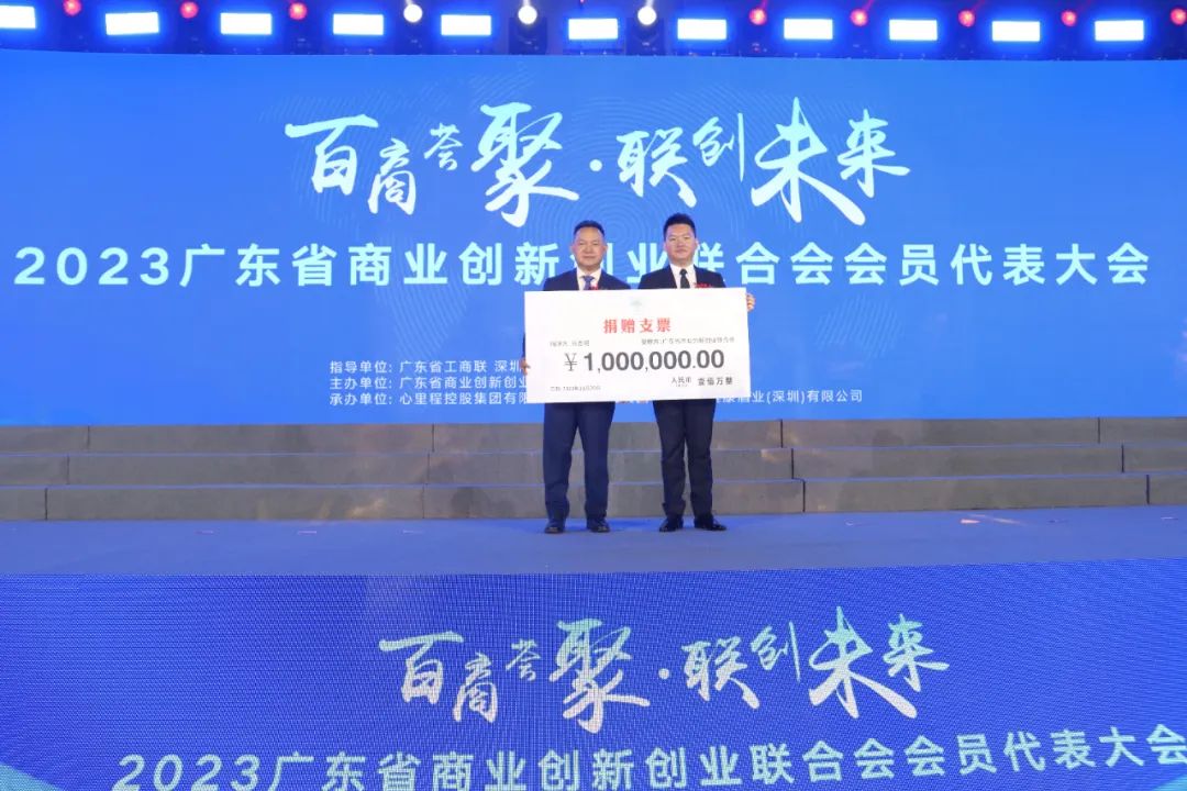 翁志明執(zhí)行會長向廣東省商業(yè)創(chuàng)新創(chuàng)業(yè)聯(lián)合會捐贈100萬元人民幣,彭國遠會長上臺接受了捐贈。