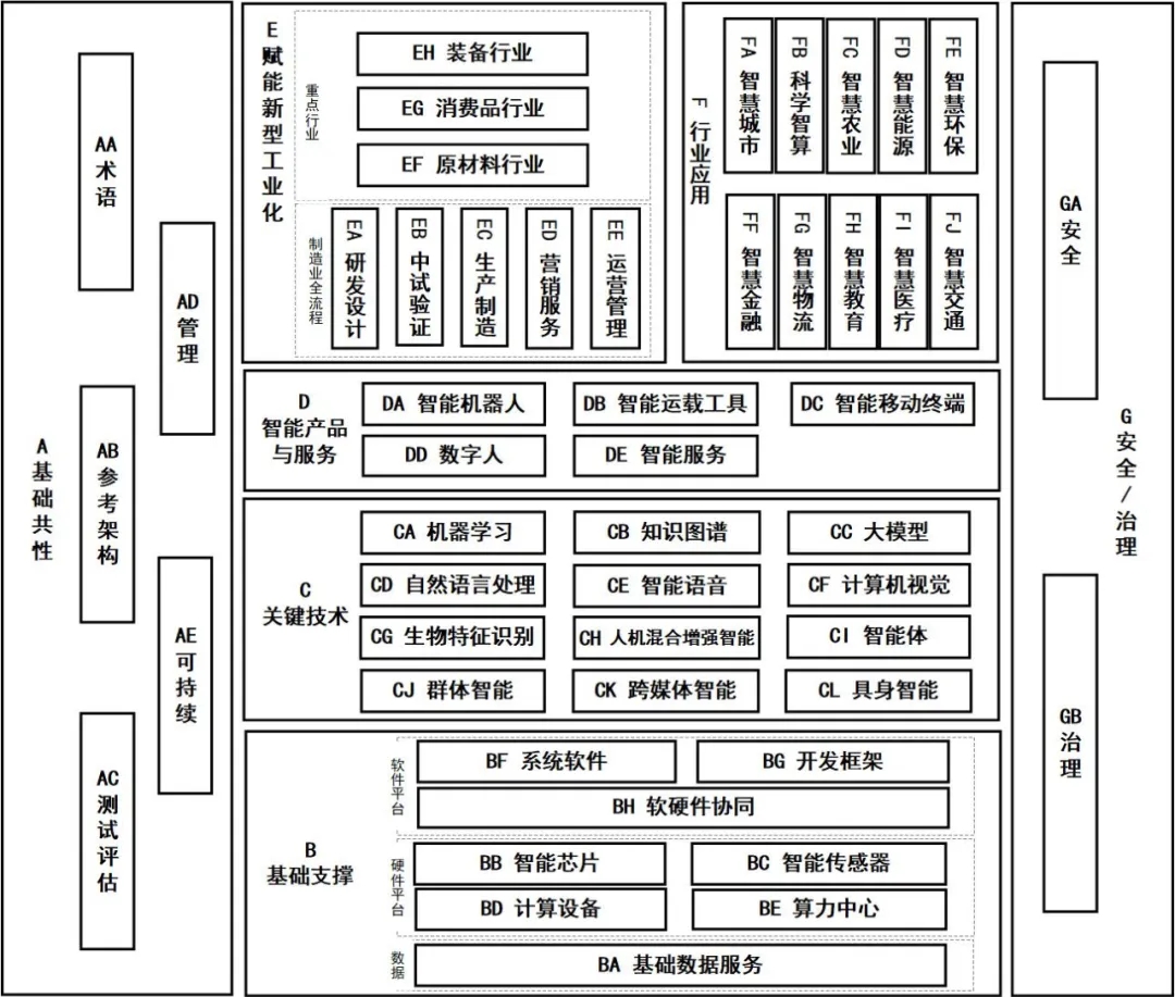 基礎共性標準主要包括人工智能術語、參考架構、測試評估、管理、可持續(xù)等標準。