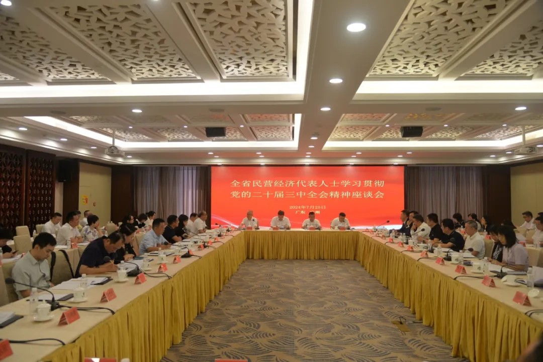 7月25日下午,廣東省工商聯(lián)組織召開全省民營經(jīng)濟代表人士學習貫徹黨的二十屆三中全會精神座談會,傳達學習黨的二十屆三中全會精神。省工商聯(lián)主席、省總商會會長、研祥高科技控股集團董事局主席陳志列出席會議并發(fā)言,省工商聯(lián)黨組成員、專職副主席馮日光出席會議并講話。全國工商聯(lián)青委會副主席、廣東省工商聯(lián)(總商會)常委、心里程控股集團創(chuàng)始人?董事長彭國遠作為民營企業(yè)代表受邀出席會議并發(fā)言。