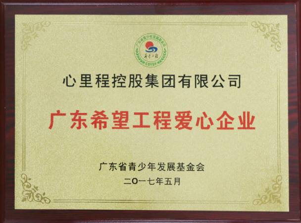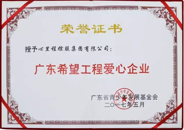 2017年5月【廣東省青少年發(fā)展基金會(huì)】授予【廣東心里程控股集團(tuán)】廣東希望工程愛(ài)心企業(yè)的稱號(hào)。