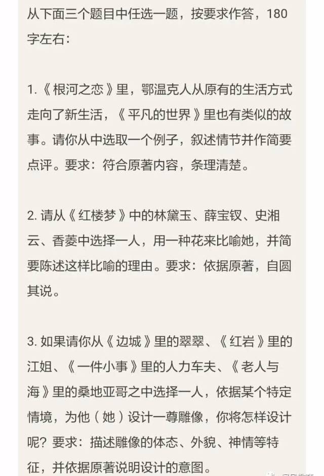 改變中國高考幾十年來文理分科帶來的偏科、知識面狹窄、過早抑制學(xué)生可塑性等的嚴(yán)重弊端,從幼升小一直到高考更大地鼓勵(lì)每個(gè)學(xué)生增加各學(xué)科知識的寬度、廣度而不是深度,從而最大限度地提升全體學(xué)生的廣泛閱讀水平,讓每個(gè)學(xué)生在全程12年的基礎(chǔ)教育中逐步建立感興趣的學(xué)科方向。高質(zhì)量的閱讀需要高水平的語文學(xué)習(xí),語文重點(diǎn)突出中國優(yōu)秀傳統(tǒng)文化。今天中午剛結(jié)束的北京高考語文,有一道小作文題,如下圖。