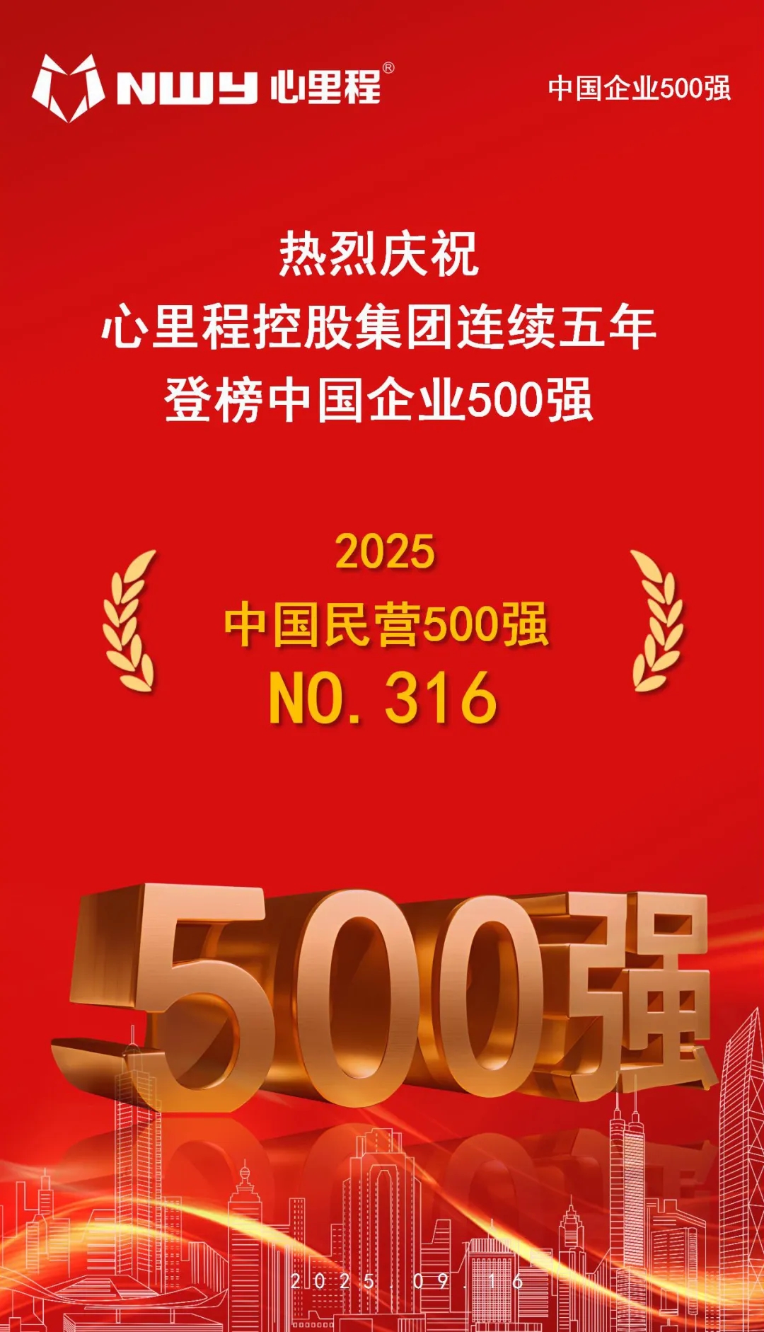 9月15日,中國企業(yè)聯(lián)合會、中國企業(yè)家協(xié)會連續(xù)第24次向社會發(fā)布了“中國企業(yè)500強” 榜單。心里程集團憑借卓越的綜合實力和穩(wěn)定的業(yè)績表現(xiàn),再度榮登該榜單,位列第316位,較去年提升5位。在此之前,心里程控股集團還以第137位的綜合成績連續(xù)八年榮登“中國民營企業(yè)500強”榜單,較2024年提升1位;同時,集團憑借在制造業(yè)領(lǐng)域的深耕突破,以第97位的排名連續(xù)三年躋身“中國制造業(yè)民營企業(yè)500強”百強序列。