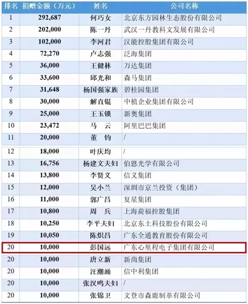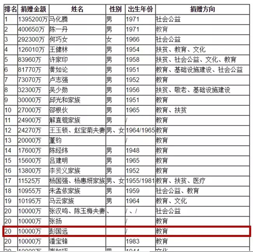 ▲“2016胡潤中國慈善富豪排行榜”前20名