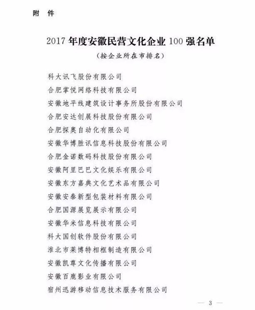 根據(jù)中共安徽省委宣傳部、安徽省文化廳、安徽省新聞出版廣電局《關(guān)于公布“2017年度安徽民營文化企業(yè)100強”名單的通知》(皖宣通字﹝2018﹞19號)的文件,安徽心里程科技有限公司成功入選“2017年度安徽民營文化企業(yè)100強”