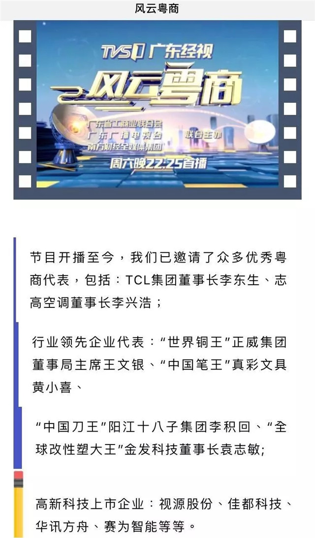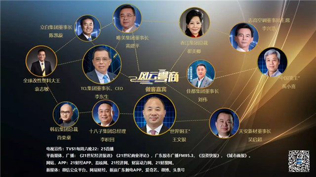 開播至今,《風(fēng)云粵商》已邀請到眾多優(yōu)秀粵商代表,包括:TCL集團(tuán)董事長李東生、志高空調(diào)董事長李興浩;行業(yè)領(lǐng)先企業(yè)代表:“世界銅王”正威集團(tuán)董事局主席王文銀、“中國筆王”真彩文具黃小喜、“中國刀王”陽江十八子集團(tuán)李積回、“全球改性塑大王”金發(fā)科技董事長袁志敏;高新科技上市企業(yè):視源股份、佳都科技、華訊方舟、賽為智能;“獨(dú)角獸”企業(yè):云從科技等。