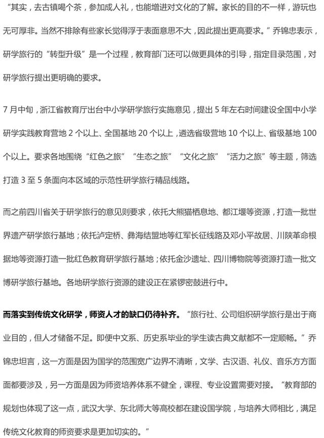 2017年11月,教育部印發(fā)《中小學(xué)綜合實踐活動課程指導(dǎo)綱要》(以下簡稱《綱要》),包括研學(xué)旅行在內(nèi)的綜合實踐活動成為中小學(xué)生必修課程。但記者發(fā)現(xiàn),《綱要》所提到的中小學(xué)生研學(xué)旅行是“由教育部門和學(xué)校有計劃地組織安排,通過集體旅行、集中食宿方式開展的研究性學(xué)習(xí)和旅行體驗相結(jié)合的校外教育活動”“與學(xué)科課程并列設(shè)置,是基礎(chǔ)教育課程體系的重要組成部分”。也就是說,將“游學(xué)”籠統(tǒng)稱為研學(xué)旅行,泛化了《綱要》的范圍,旅行社、培訓(xùn)機構(gòu)組織的游學(xué)只是取了一個籠統(tǒng)說法,模糊了研學(xué)的本義。