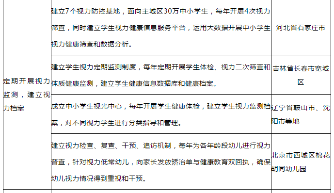 (二)定期開展視力監(jiān)測(cè),建立視力健康檔案。江西省、湖北省武漢市、江蘇省南京市、河北省石家莊市、天津市北辰區(qū)、遼寧省鞍山市和沈陽市、吉林省長春市寬城區(qū)、北京市西城區(qū)棉花胡同幼兒園等地方和學(xué)校建立學(xué)生視覺環(huán)境、視覺行為和視力健康狀況監(jiān)測(cè)體系,每年定期開展學(xué)生體檢、視力二次篩查和體質(zhì)健康監(jiān)測(cè),建立學(xué)生健康信息數(shù)據(jù)庫和健康檔案,及時(shí)更新篩查結(jié)果,完善醫(yī)院—學(xué)校—家長—學(xué)生視力健康實(shí)時(shí)監(jiān)測(cè)與預(yù)警機(jī)制。