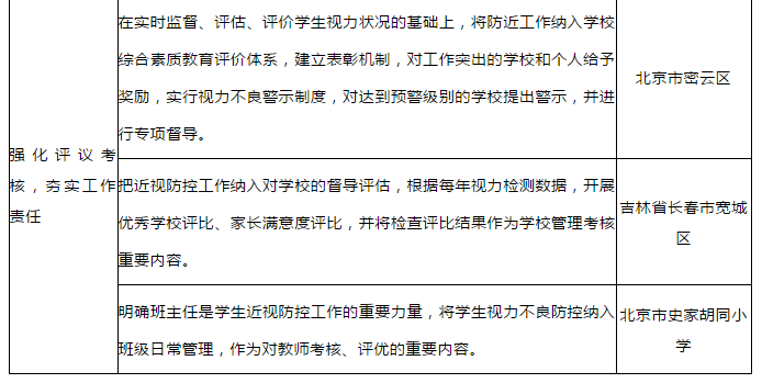 (九)強(qiáng)化考核督導(dǎo),夯實(shí)工作責(zé)任。山東省、浙江省、云南省、湖北省武漢市、江蘇省揚(yáng)州市、北京市密云區(qū)、四川省資陽市、吉林省長春市寬城區(qū)、北京市史家胡同小學(xué)等地方和學(xué)校將兒童青少年近視防控、降低學(xué)生視力不良率納入對(duì)地方黨政主要領(lǐng)導(dǎo)、教育行政部門、學(xué)校、班級(jí)和班主任考核內(nèi)容,對(duì)考核排名靠前的進(jìn)行表彰獎(jiǎng)勵(lì),對(duì)近視發(fā)生率不能降低的進(jìn)行通報(bào)和問責(zé)。