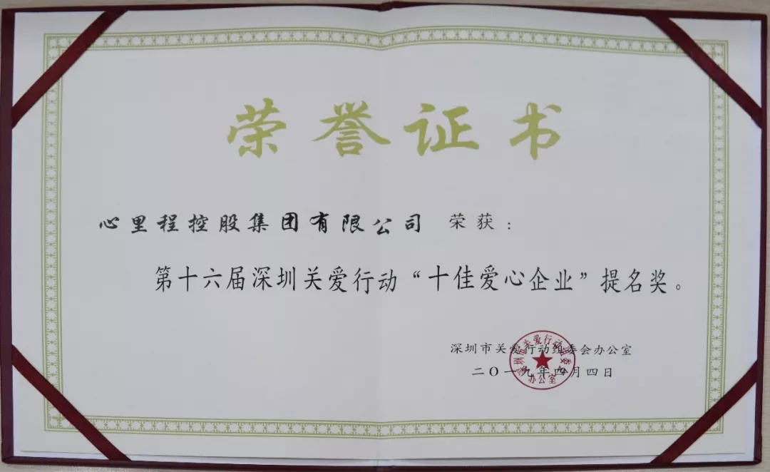 心里程集團榮獲第十六屆深圳關愛行動“十佳愛心企業(yè)”提名獎