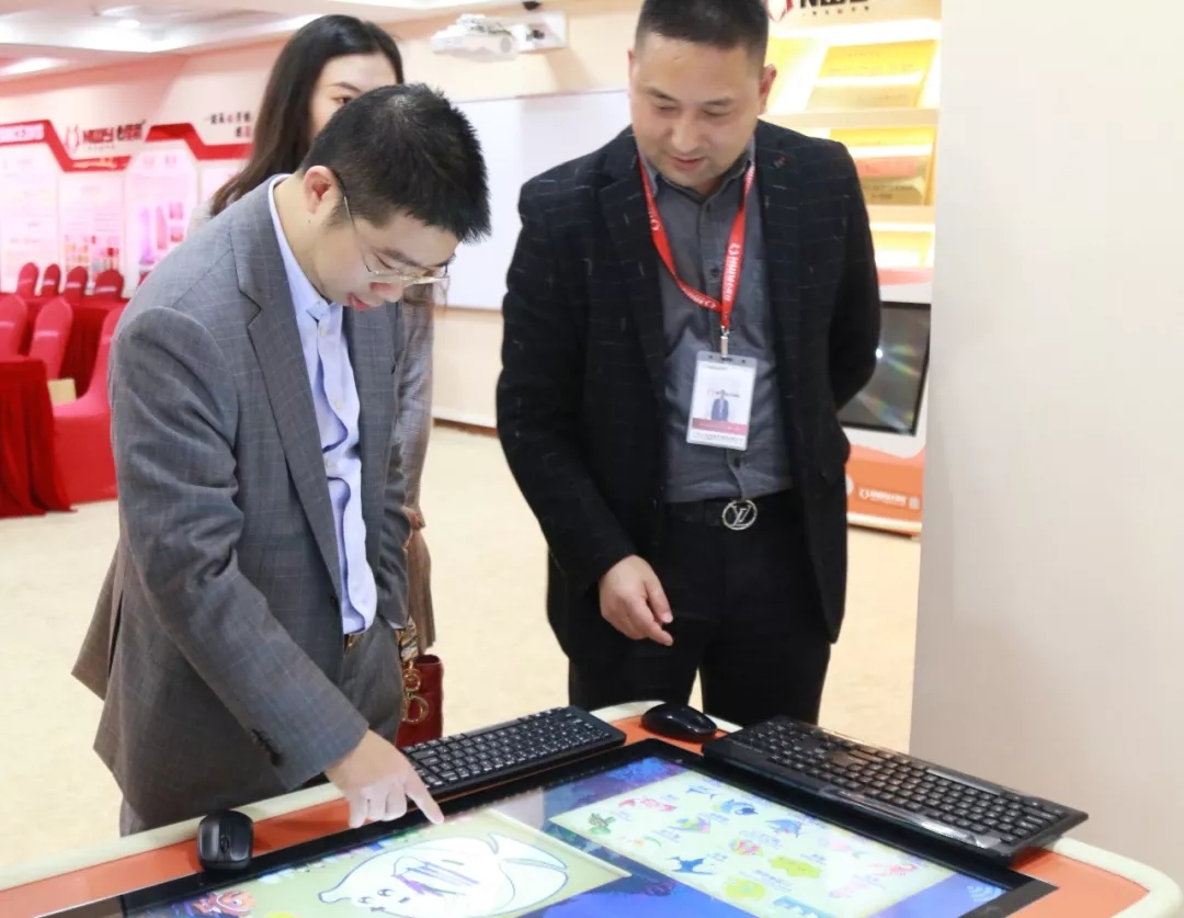 心里程投資集團(tuán)張玉常務(wù)副總裁(右一)陪同黃仕坤會(huì)長(zhǎng)一行體驗(yàn)心里程幼教系列產(chǎn)品