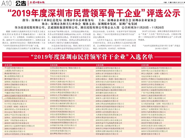 ●11月20日,深圳特區(qū)報(bào)A10版公示了“2019年度深圳市民營領(lǐng)軍骨干企業(yè)”入選名單,共100家包括華為投資控股有限公司、正威國際有限公司、騰訊控股有限公司、心里程控股集團(tuán)有限公司等企業(yè)入圍。