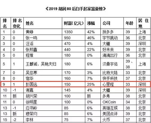●10月28日,《2019胡潤80后白手起家富豪榜》重磅發(fā)布,這是胡潤研究院連續(xù)第四次發(fā)布次榜單,財(cái)富計(jì)算的截止日期為2019年8月15日。彭國遠(yuǎn)董事長以150億元財(cái)富躍居榜單第9位。