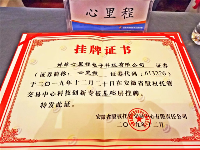 ●12月20日,應(yīng)安徽省股權(quán)托管交易中心邀請(qǐng),蚌埠心里程電子科技有限公司參加2019年第五場(chǎng)科創(chuàng)專板企業(yè)正式掛牌儀式,證券代碼:613226。