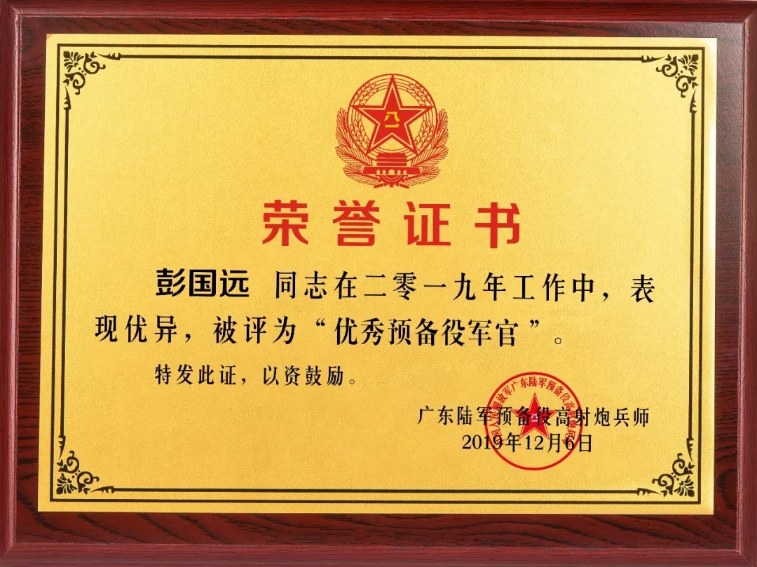 2019彭國遠榮獲廣東陸軍預(yù)備役防化團建團二十周年先進個人