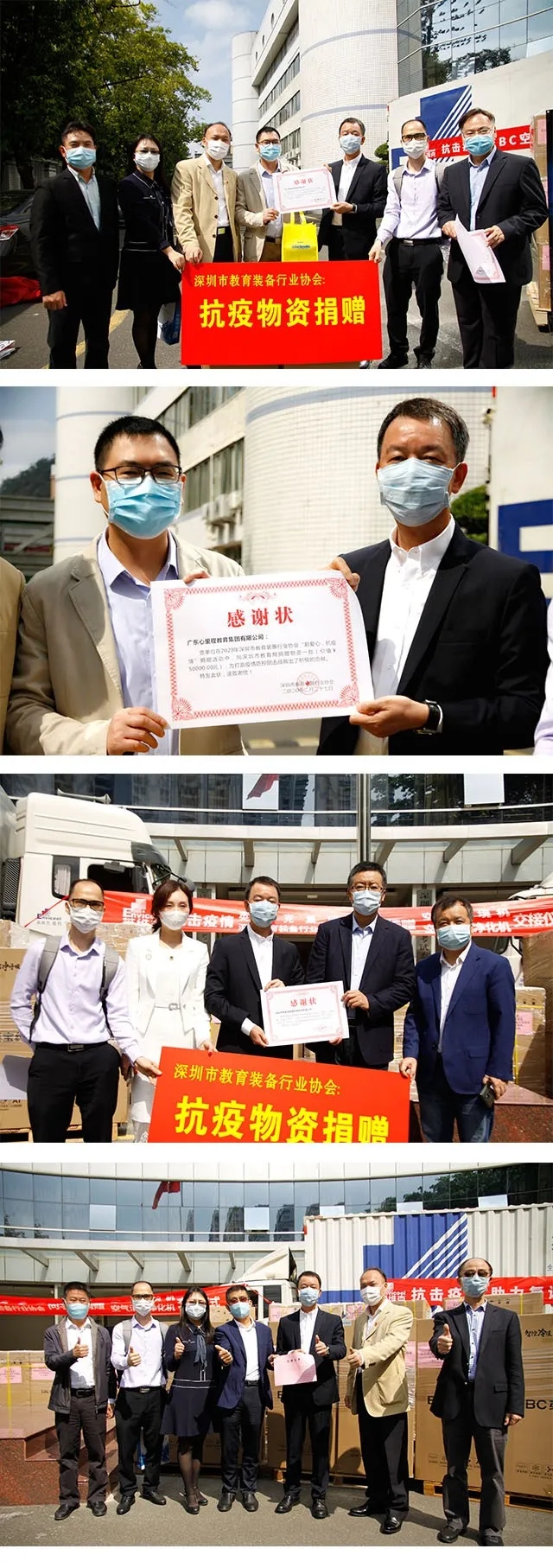這次助力教育系統(tǒng)抗疫的捐贈(zèng)活動(dòng)獲得了深圳市教育裝備行業(yè)協(xié)會(huì)內(nèi)眾多愛心會(huì)員企業(yè)、個(gè)人的積極響應(yīng),深圳市教育裝備行業(yè)協(xié)會(huì)會(huì)長、心里程控股集團(tuán)總裁彭錦環(huán)代表協(xié)會(huì)為積極參與捐贈(zèng)活動(dòng)的愛心企業(yè)、個(gè)人頒發(fā)了感謝狀。