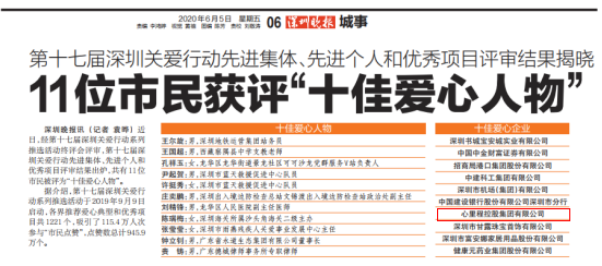 6月5日,經(jīng)第十七屆深圳關(guān)愛(ài)行動(dòng)系列推選活動(dòng)終評(píng)會(huì)評(píng)審,第十七屆深圳關(guān)愛(ài)行動(dòng)先進(jìn)集體、先進(jìn)個(gè)人和優(yōu)秀項(xiàng)目評(píng)審結(jié)果正式出爐,心里程控股集團(tuán)獲評(píng)“十佳愛(ài)心企業(yè)”。